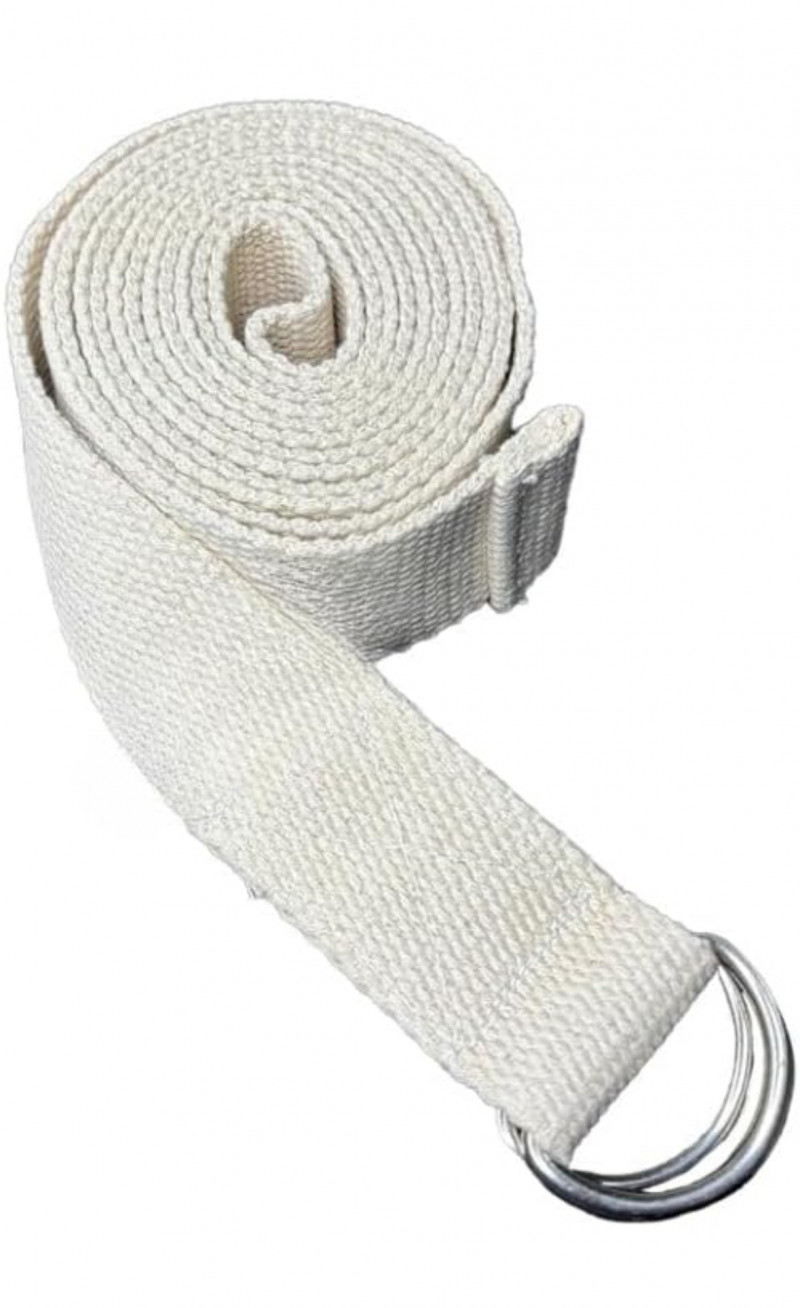 100% cotton 9 ft long off white colour yoga belt suitable for all yoga style activities, floor exercises, pilates. Adjustable D buckle belt.